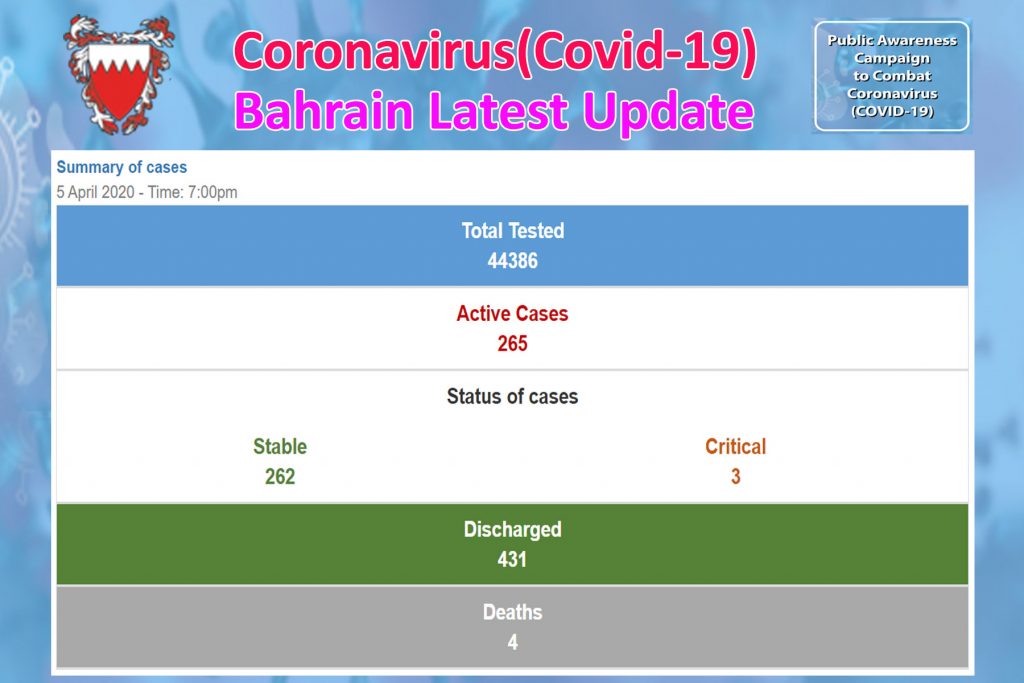 Bahrain tested a total of 44386 until now. There are 265 active cases. These include 262 stable cases and 3 critical cases. 431 people have been discharged. Only 4 death has been reported until now.