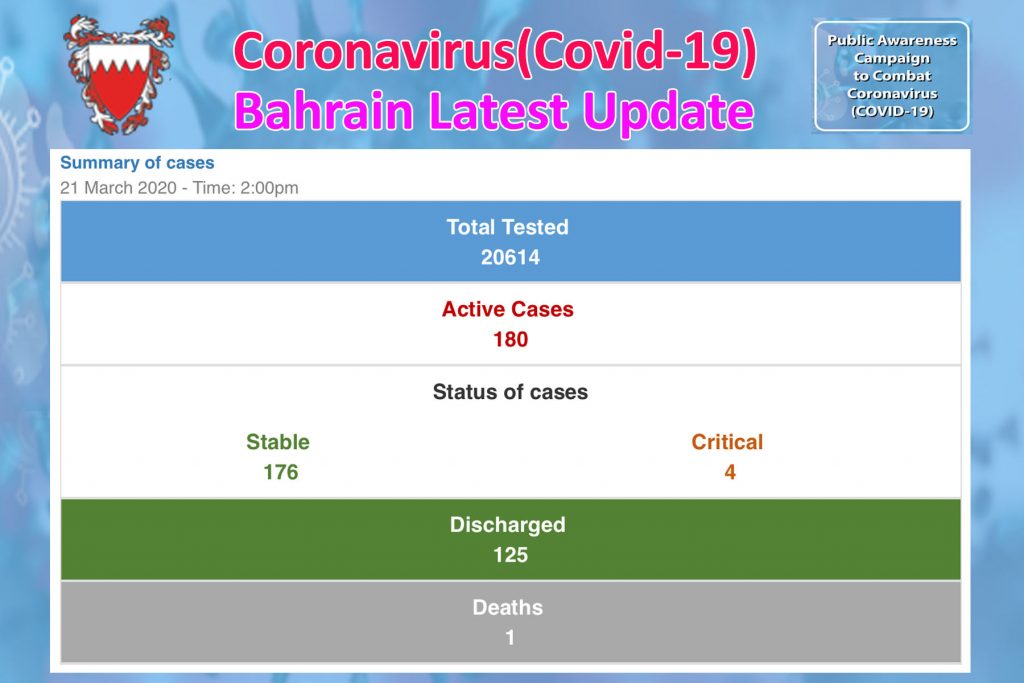 Share Facebook Twitter LinkedIn Pinterest Email Bahrain tested a total of 20614 until now. There are 180 active cases. These include 176 stable cases and 4 critical cases. 125 people have been discharged. No new death has been reported