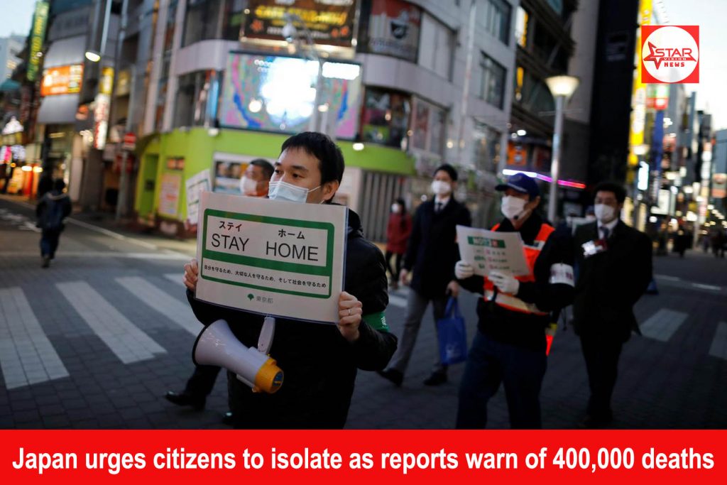 Japan urged its citizens on Wednesday to stay home, as media reports warned that as many as 400,000 of them could die of the coronavirus without urgent action, and Prime Minister Shinzo Abe came under pressure to hand out more cash, reported Reuters.