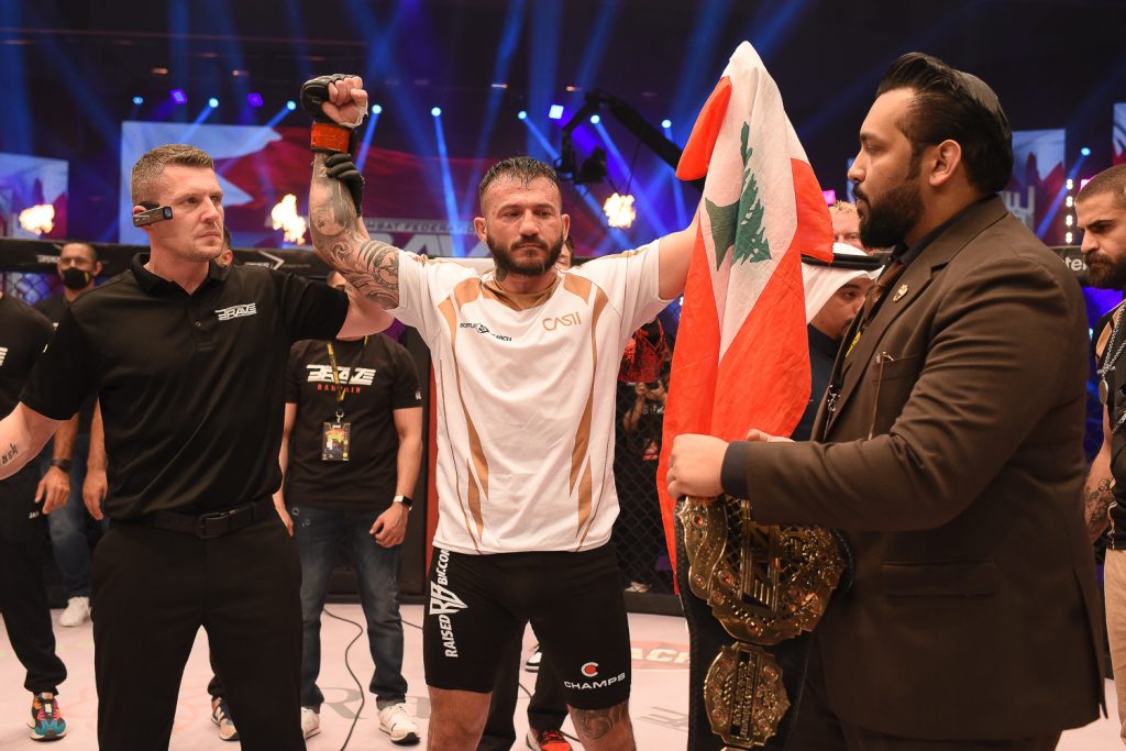 Mohammad Fakhreddine made combat sports history on Friday night at BRAVE Combat Federation’s first event of 2022, held in the Kingdom of Bahrain. “The Latest” defied all odds and became the first-ever Arab double division World Champion in the history of Mixed Martial Arts, knocking out bitter rival Mohamed Said Maalem and becoming the new Light Heavyweight World Champion of BRAVE CF.