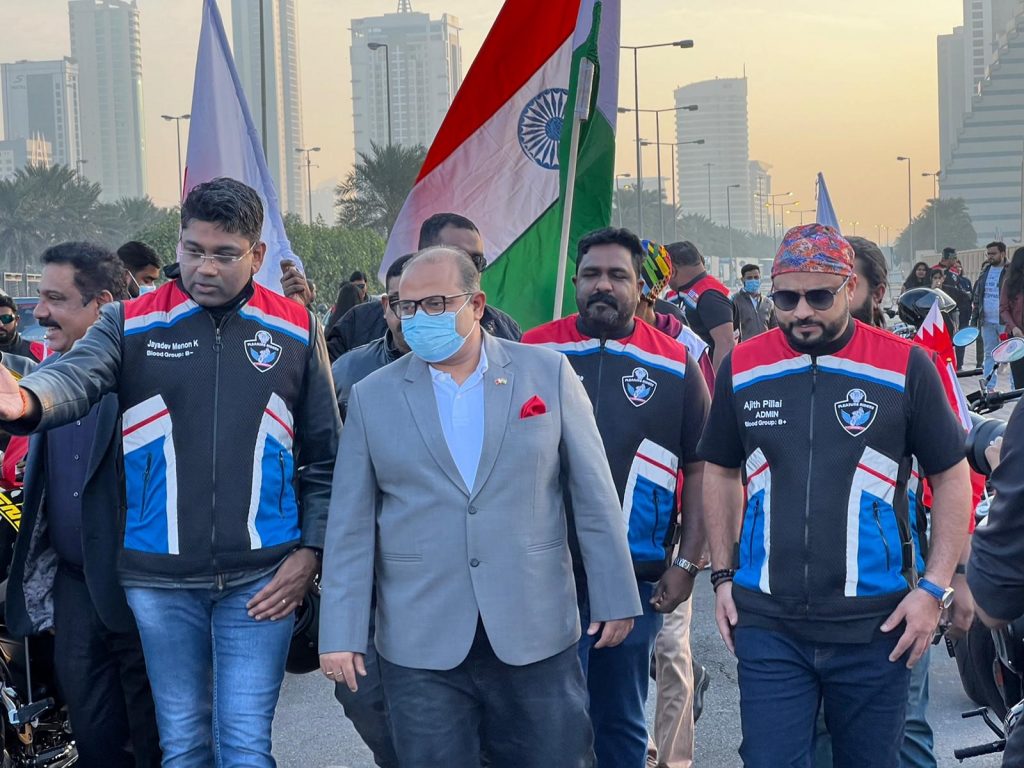 Bahrain :  One of the leading motorcycle riding groups in Bahrain, *Pleasure Riders*, celebrated the 50th National Day of Bahrain by conducting a mega ride *‘Tribute to Bahrain’* which started from the Bahrain Mall and ended at Zallaq. The colorful ride was flagged off by H.E. Shri. Piyush Shrivastava, Ambassador of India to the Kingdom of Bahrain.